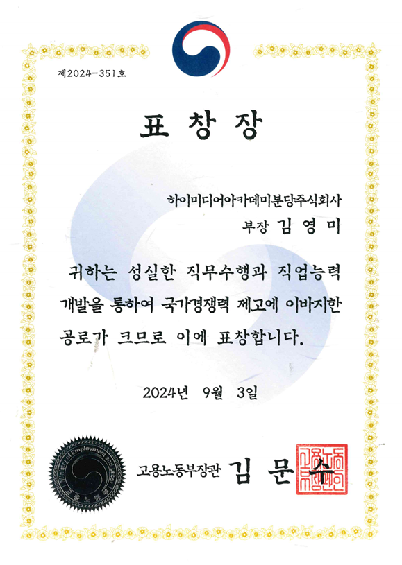 하이미디어 아카데미 분당캠퍼스가 장관상을 수상하였습니다.